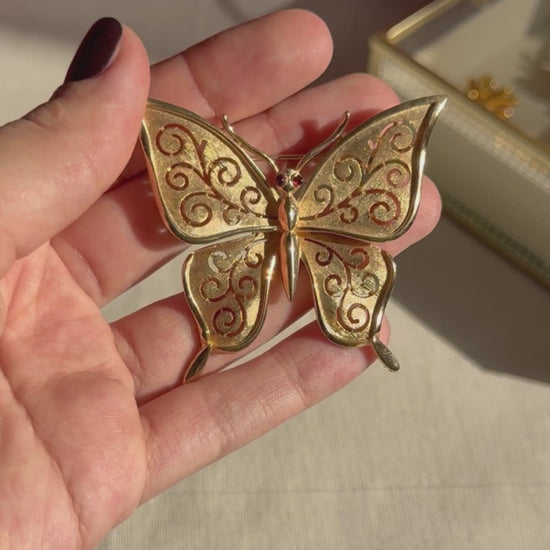 Broche papillon florentine en or Crown Trifari avec yeux rouge rubis et tourbillons