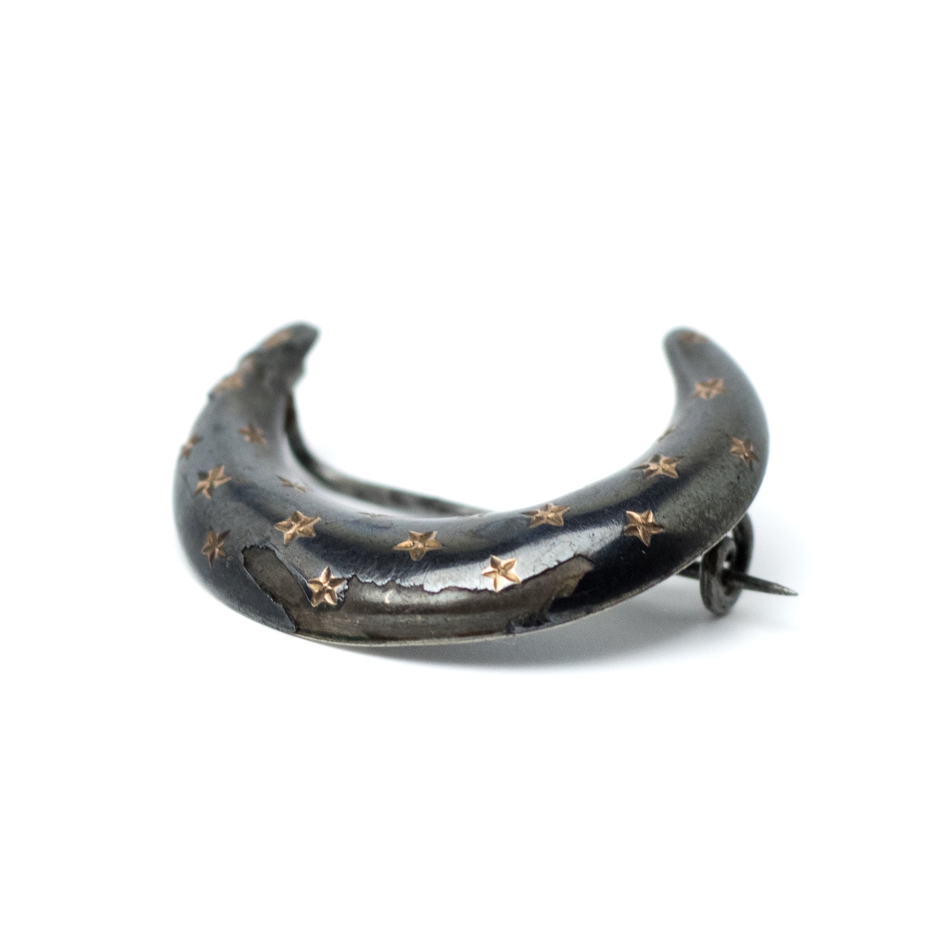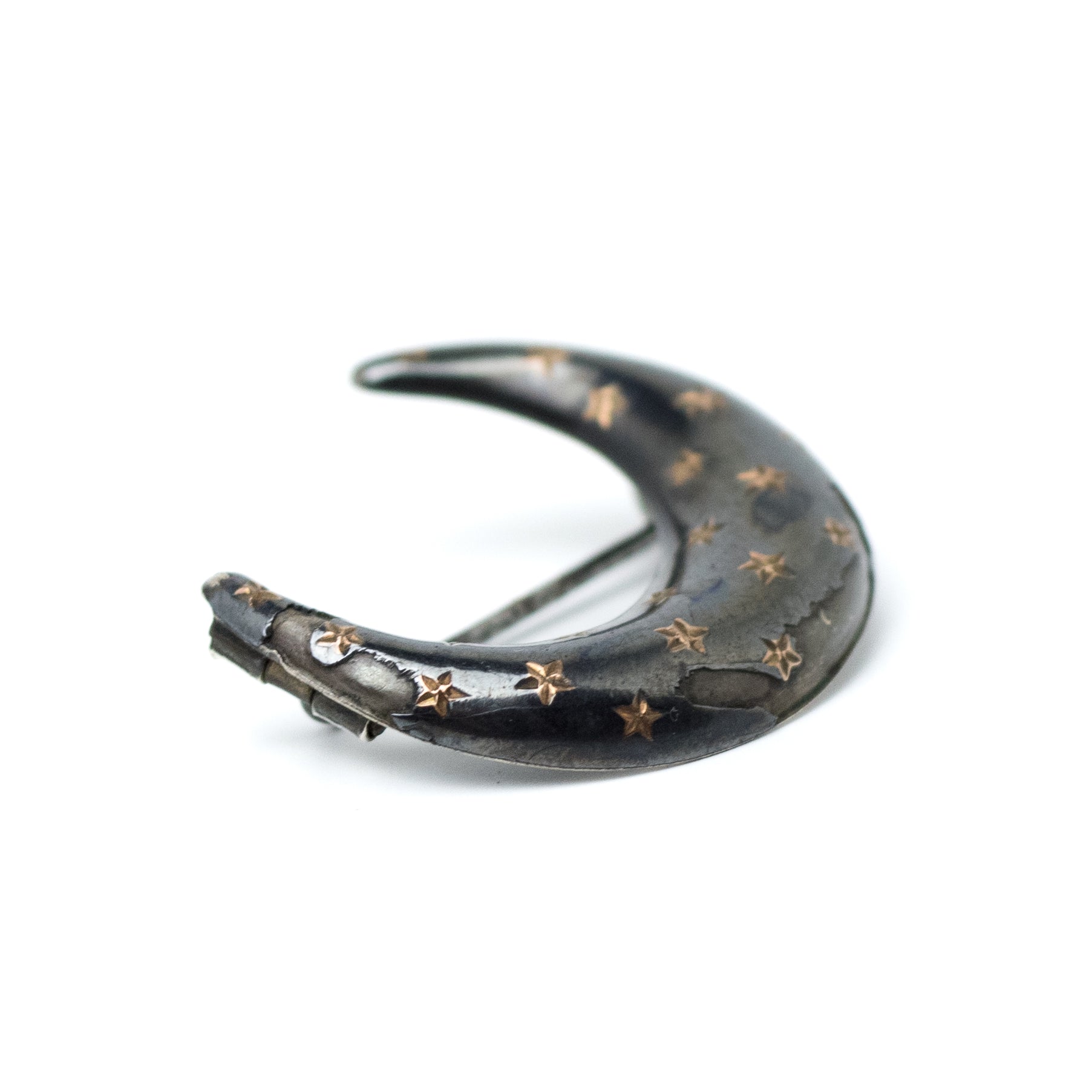 Antique Victorian silver moon pin crafted in the niello technique, a fine example of 19th-century metal artistry. The crescent moon design, deeply symbolic in Victorian jewelry, represents femininity and transformation. Dark enamel contrasts with the silver ground to create a subtle, timeless elegance.