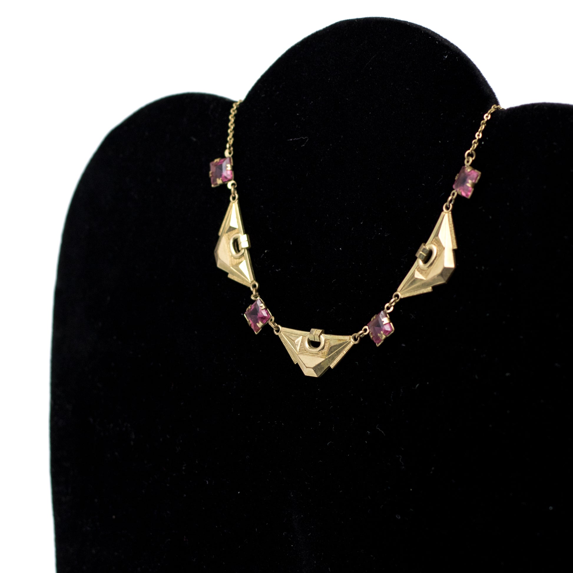 Art Deco necklace featuring geometric gold-tone panels set with vibrant pink glass stones. The stepped architectural elements capture the distinctive angular aesthetic of the 1920s–30s era.
