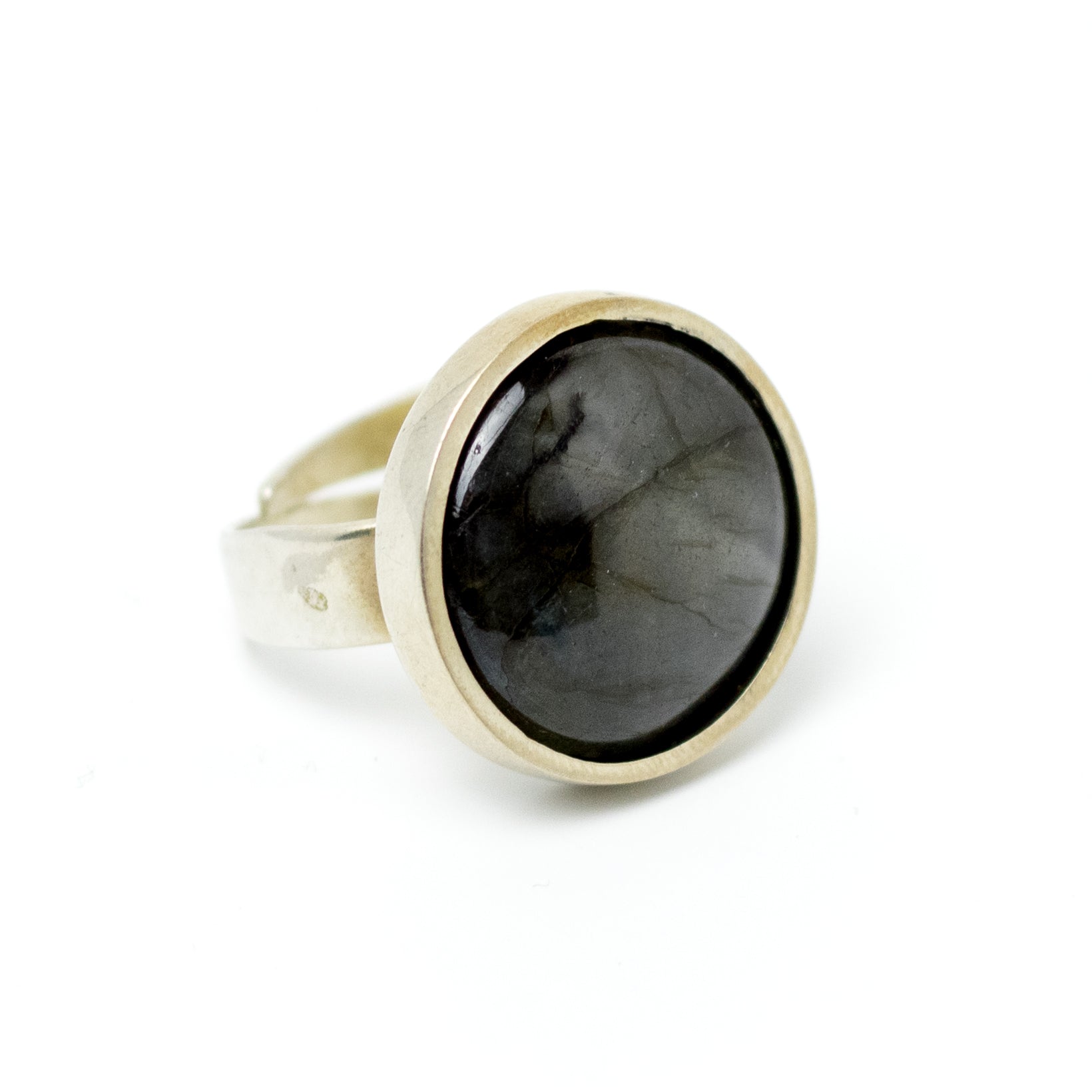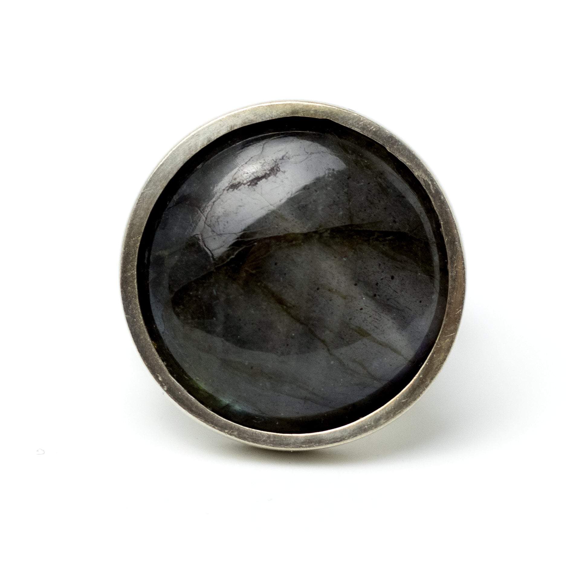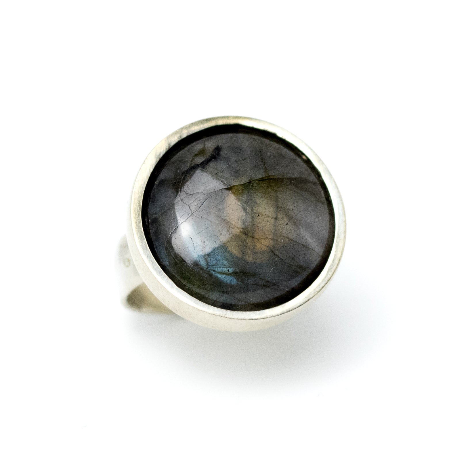This modernist Scandinavian ring by Bengt Hallberg features a closed sterling silver bezel holding a large round labradorite cabochon characterized by natural surface lines and a distinctive sheen.