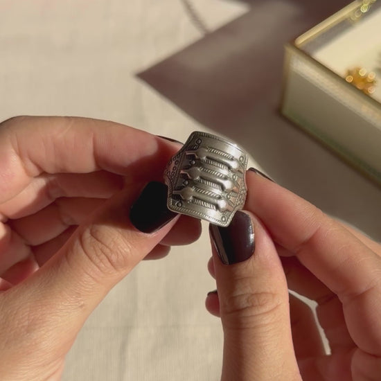 This silver "Saga" ring from Norwegian David-Andersen jewelry company is a faithful replica of a 300 A.D. embossed ring found in a wealthy couple's grave. A true piece of history, this ring is a must-have for any collector or history enthusiast.