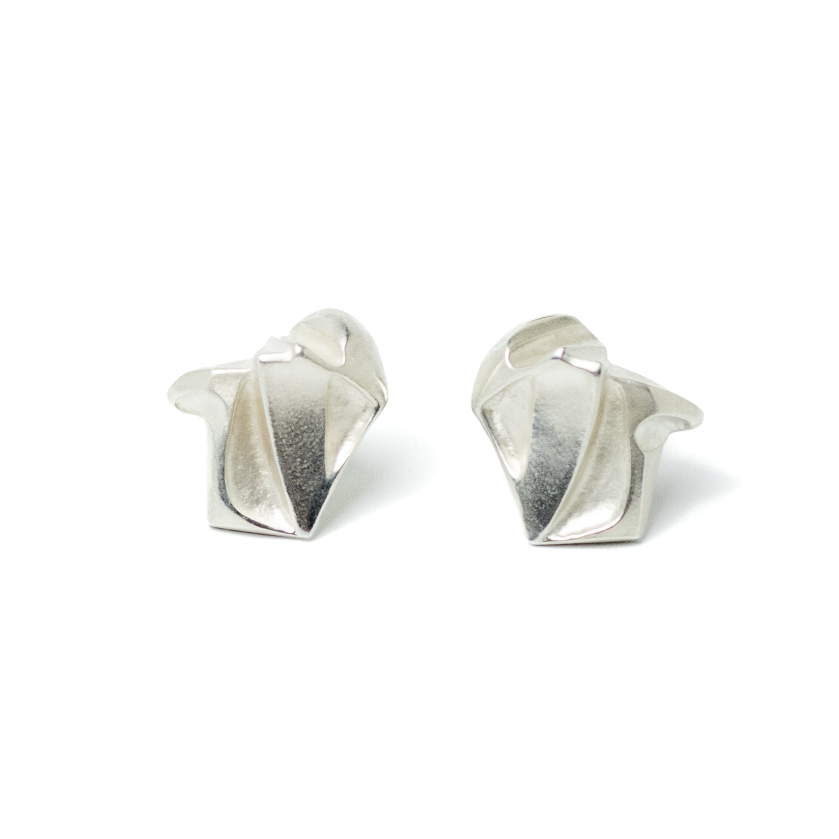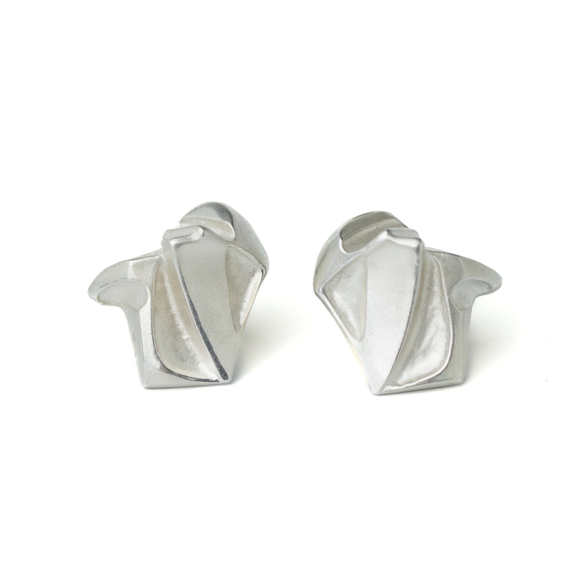 These sculptural stud earrings are the Nastassia design by the Finnish artist Björn Weckström for Lapponia. The surface combines a soft matte finish with crisp ridges.
