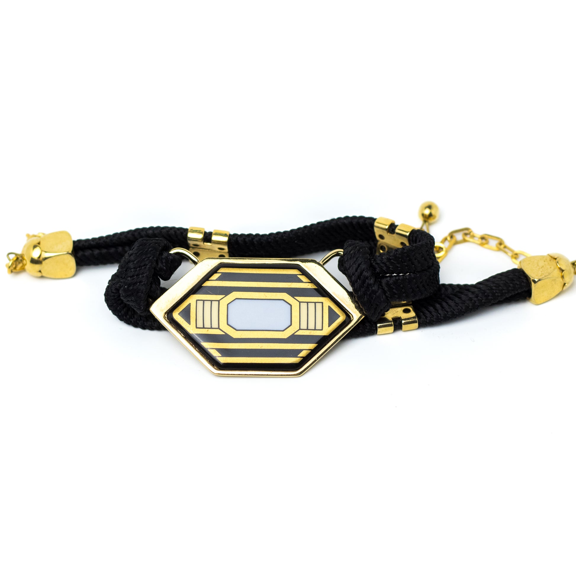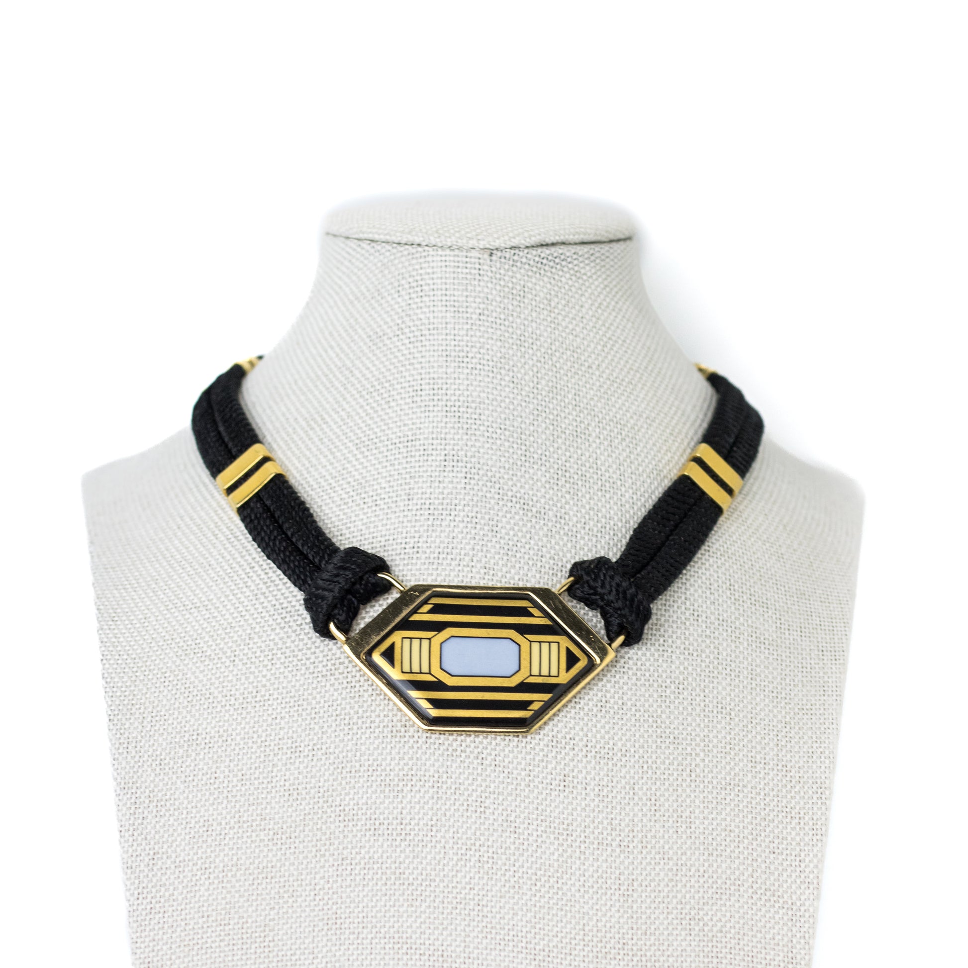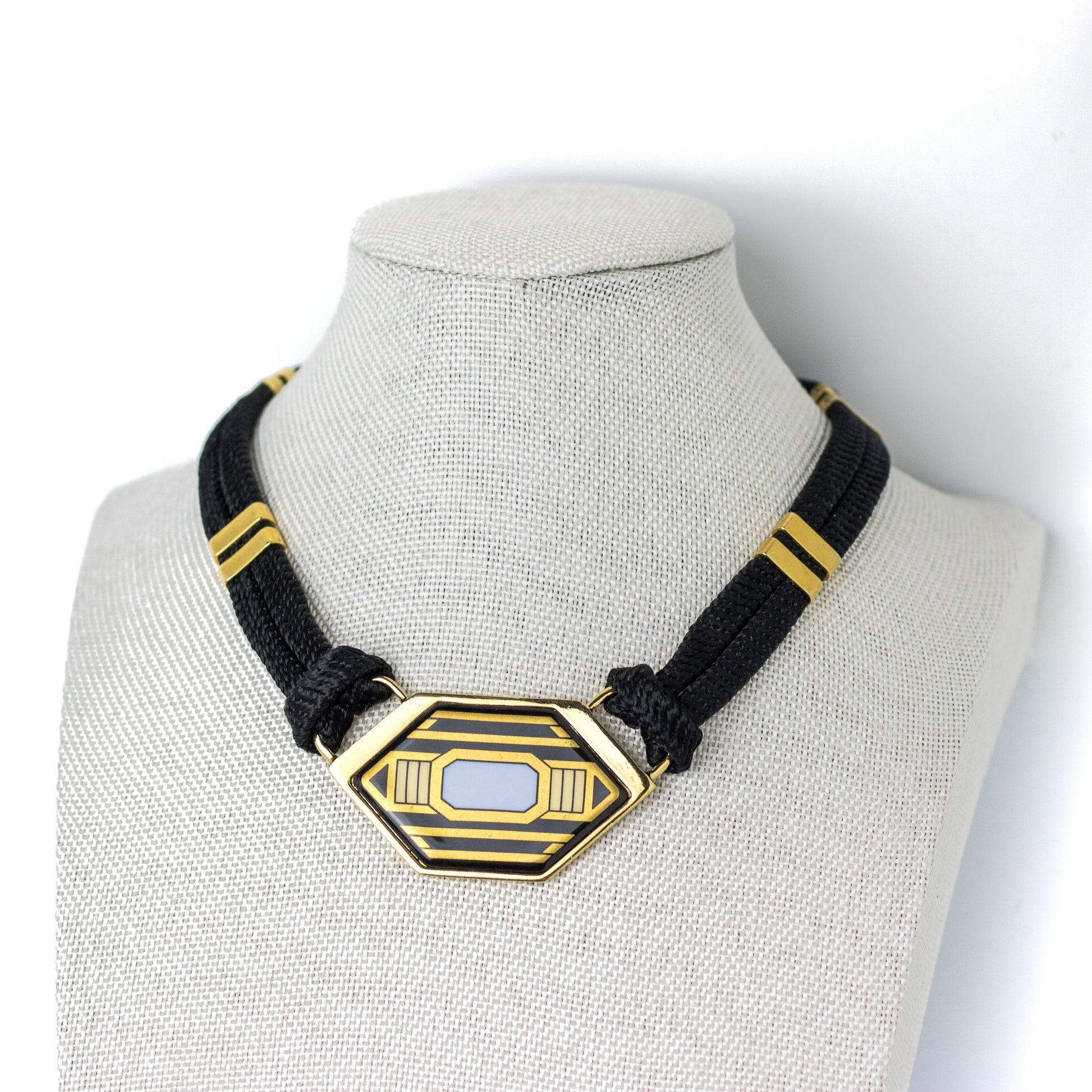 Vintage Michaela Frey Art Deco-style choker necklace featuring a striking geometric enamel centerpiece in black and gold tones. The centerpiece is connected to a double black cord with gold-tone fittings and an adjustable extension chain.