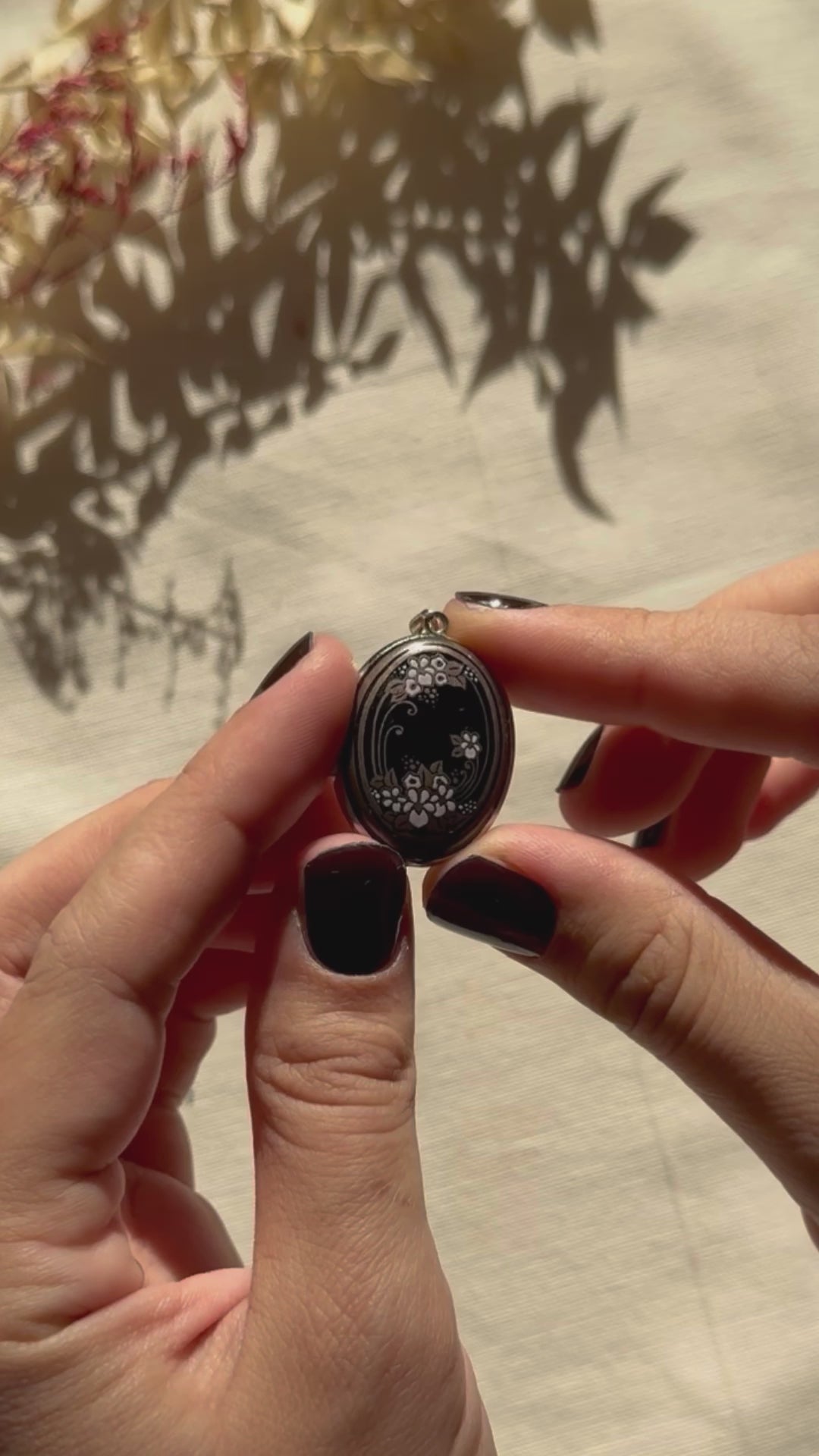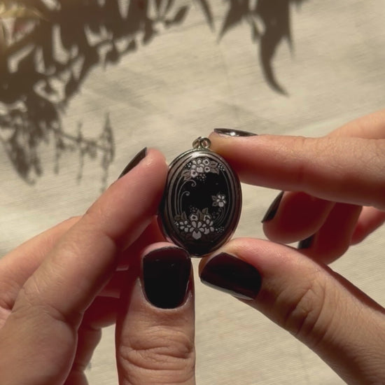 Michaela Frey Black Enamel Floral Locket Pendant Vintage Austrian Jewelry