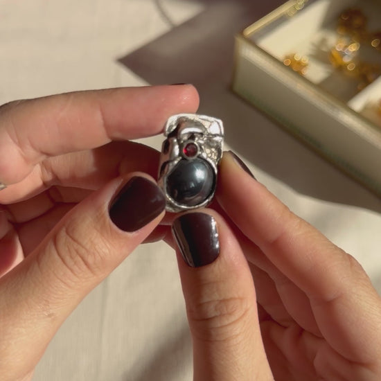 Expertly crafted by Monika & Burkhard OLY, Pforzheim, this brutalist silver pendant features a stunning bloodstone and smaller faceted garnet. Discover a complementary ring from the same jeweller in our store as well.