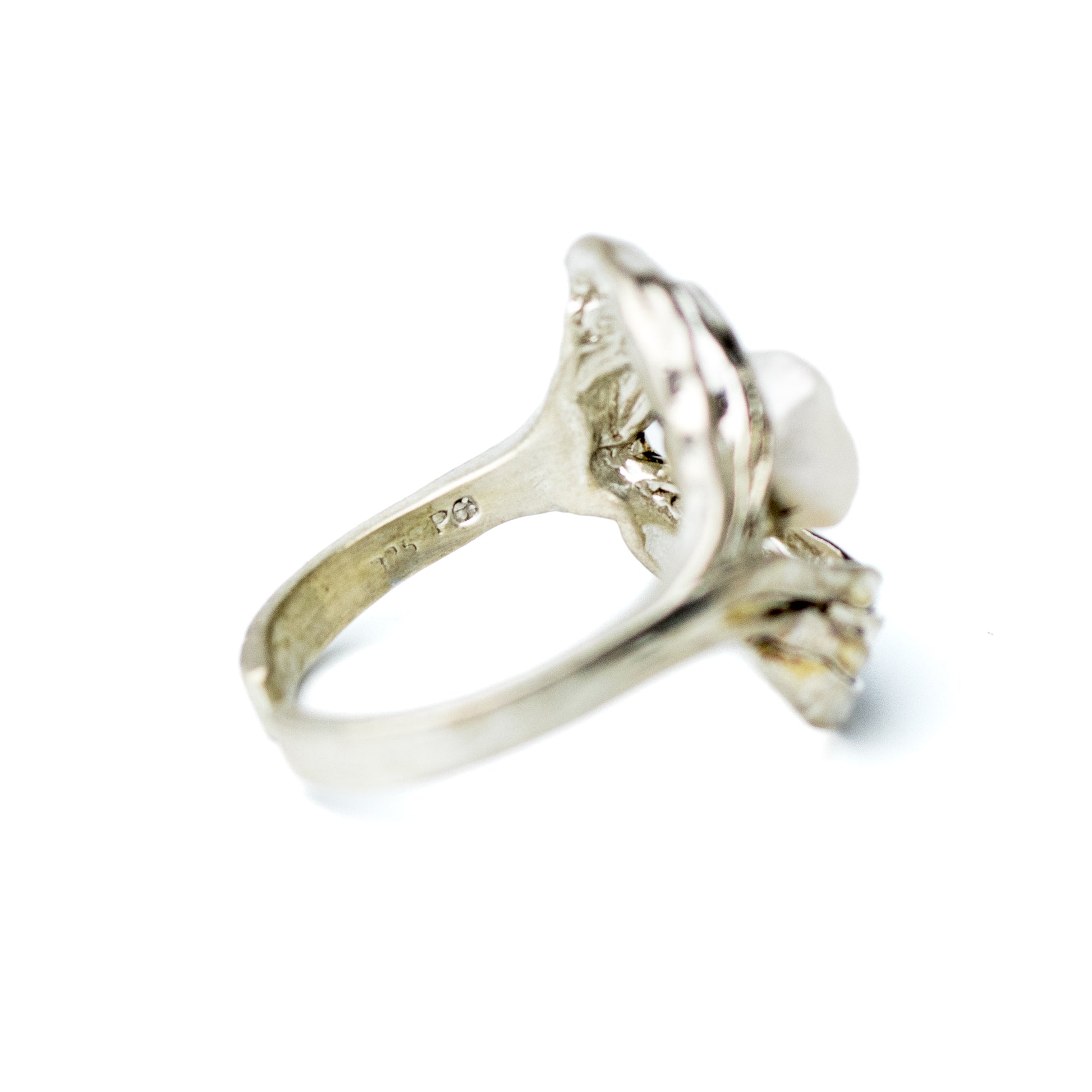 This vintage ring with adjustable size was made by Perli, Germany, in sterling silver and set with a natural pearl. The sculptural silver mount frames the pearl in an eye-shaped design that reflects Perli’s modernist aesthetic.