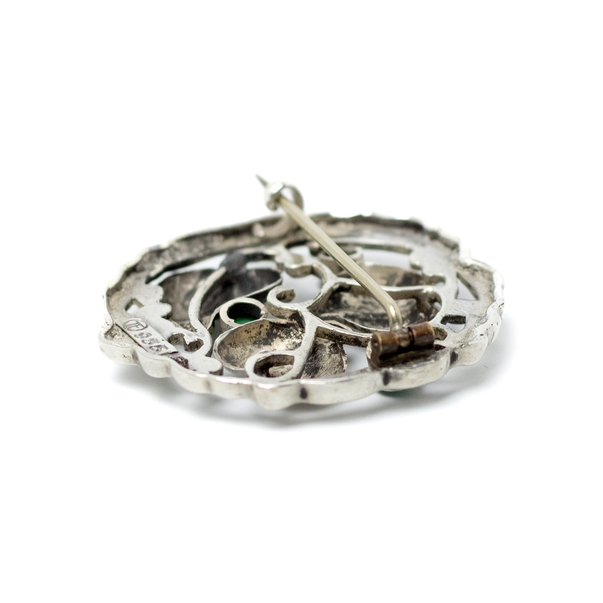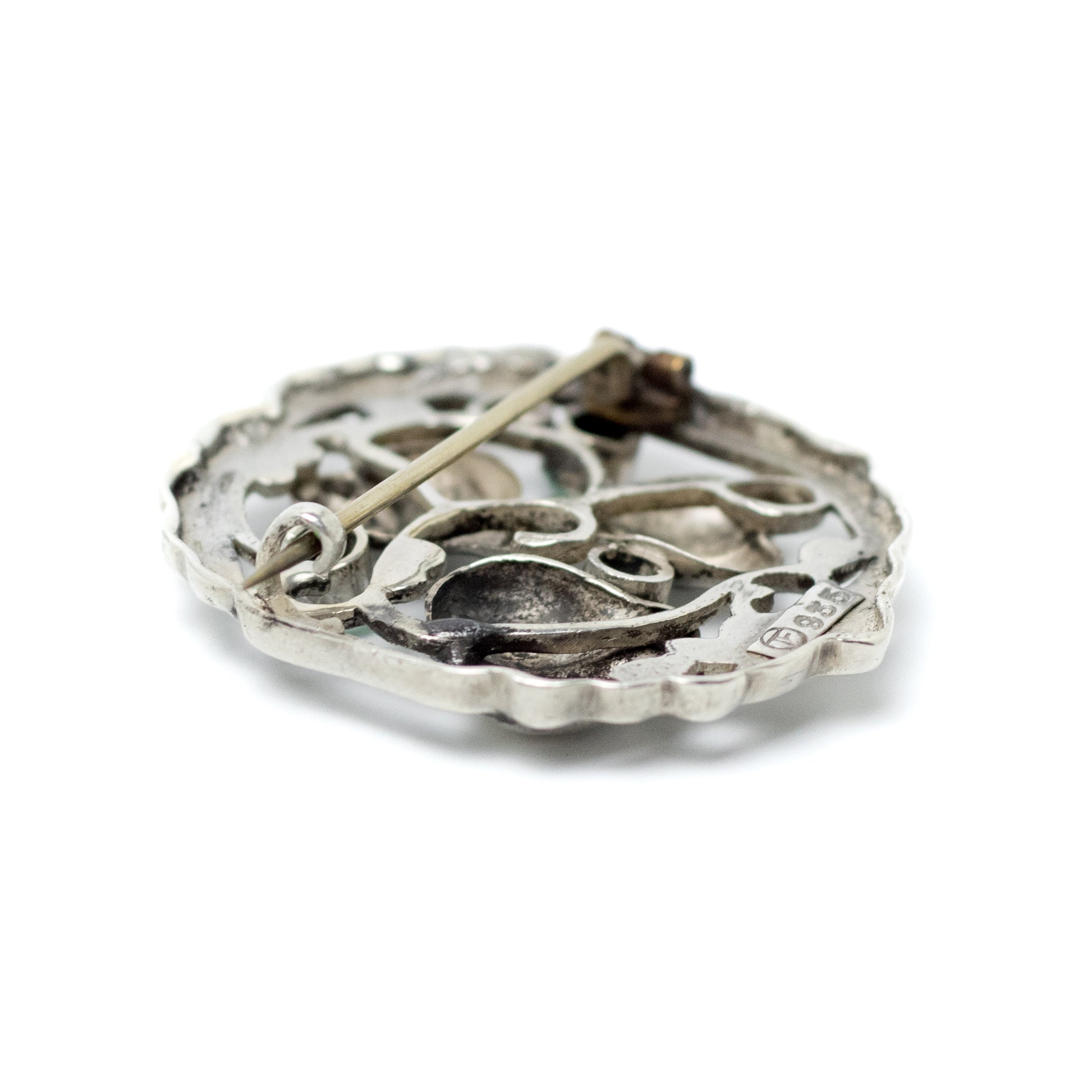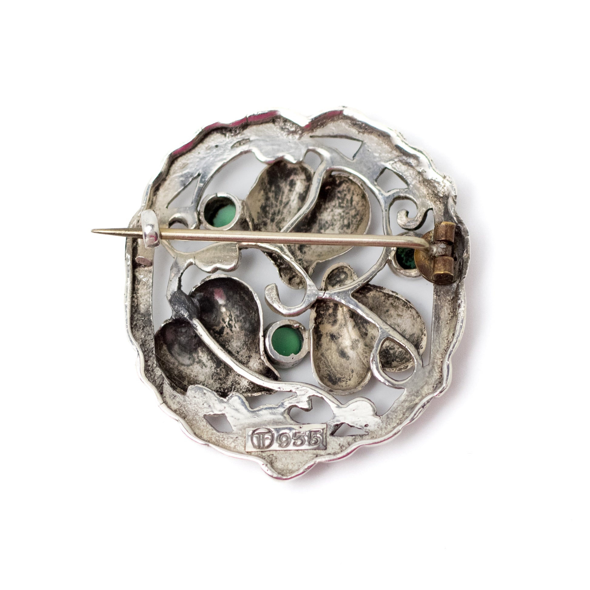 Stamped on the reverse TF in a circle and 935. Secures with a C-clasp.