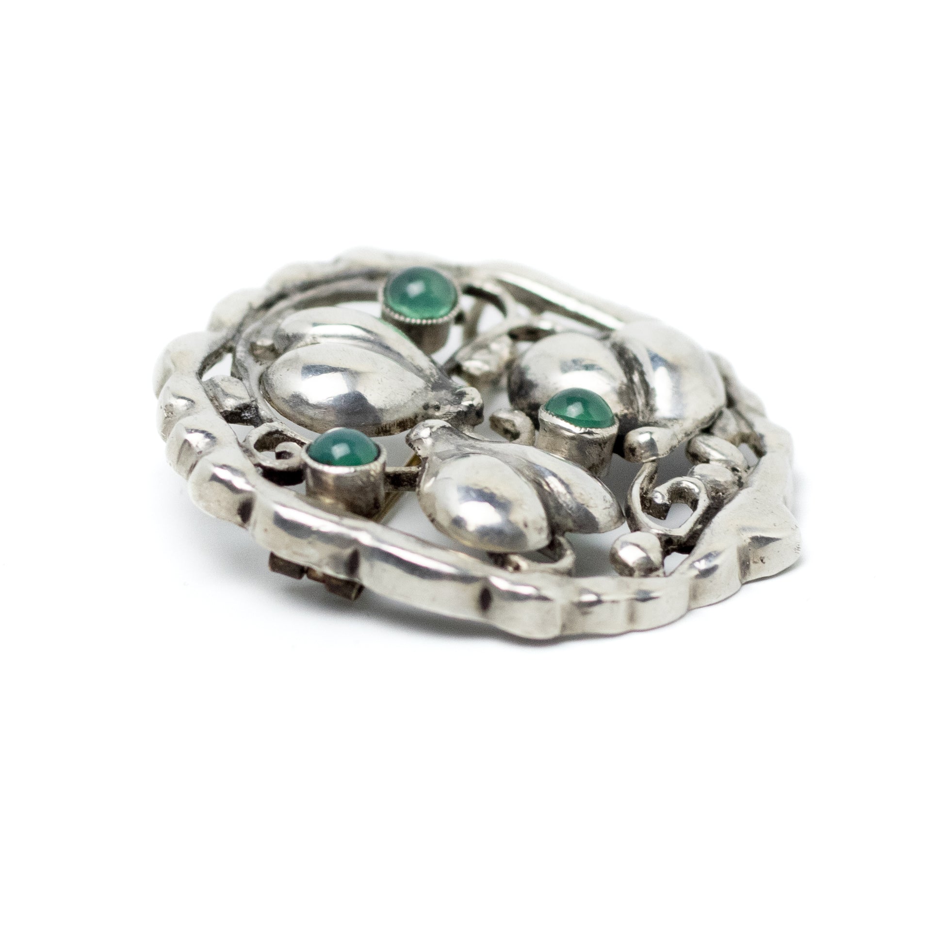 Theodor Fahrner Art Nouveau Silver Leaf Hearts Brooch with Green Chalcedony