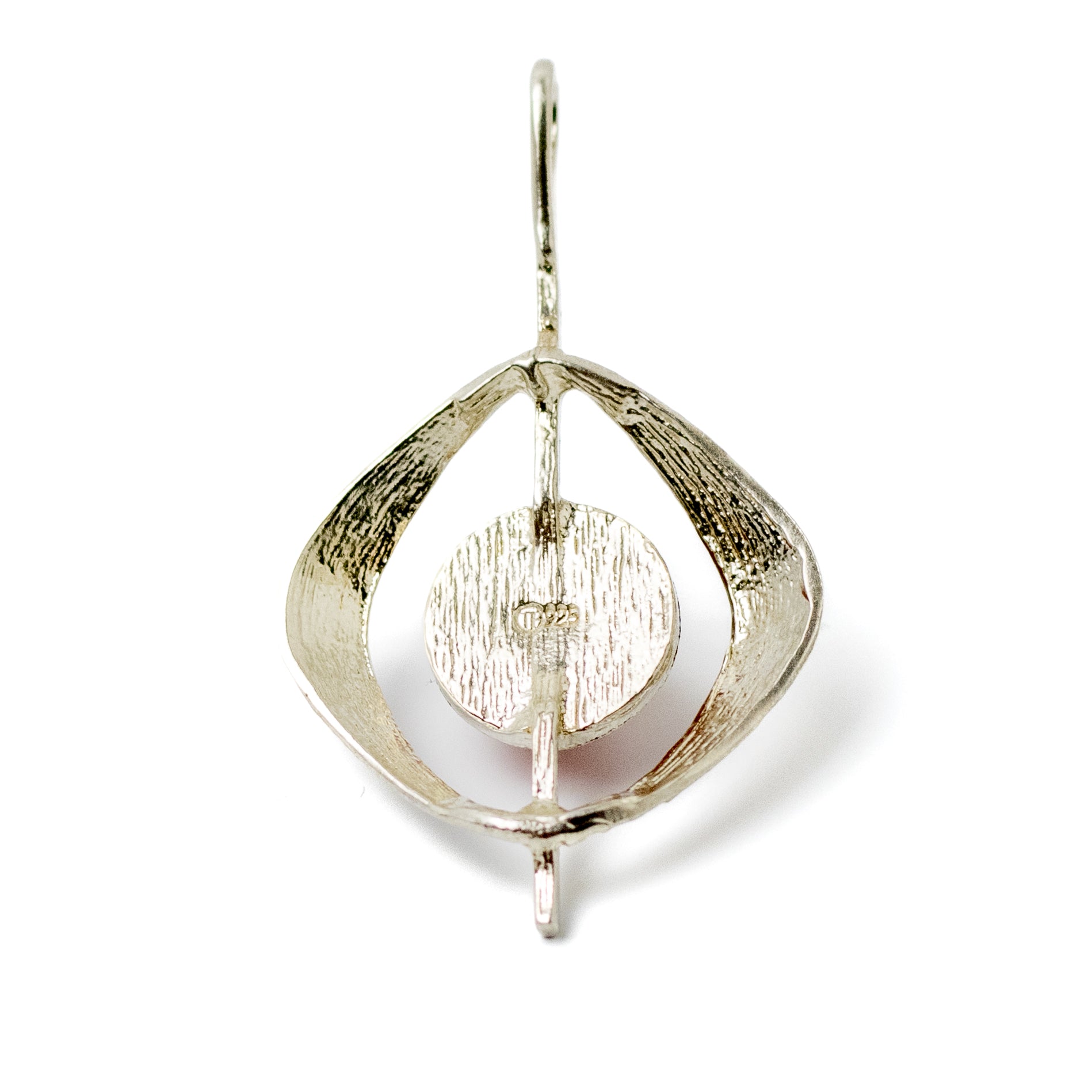 This vintage silver pendant was created in the 1970s by Theodor Fahrner, one of Germany’s most influential modernist jewelry manufacture. The piece features an openwork frame crafted in solid sterling silver and is set with a red carnelian cabochon. The pointed shape of the stone adds sculptural dimension and contrasts beautifully with the textured silver base.