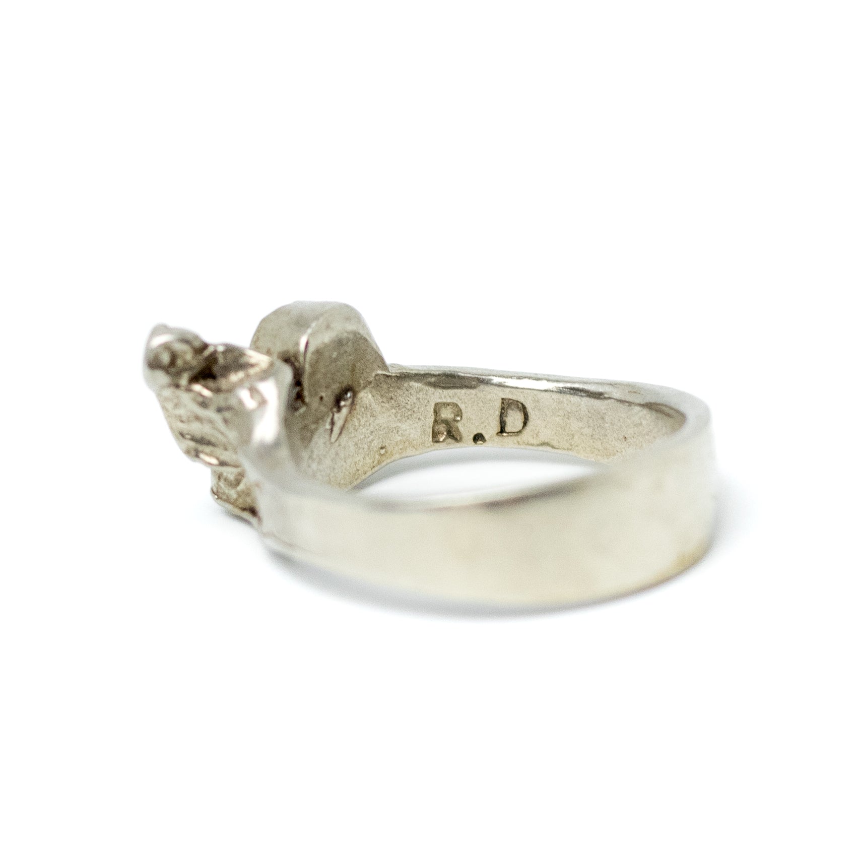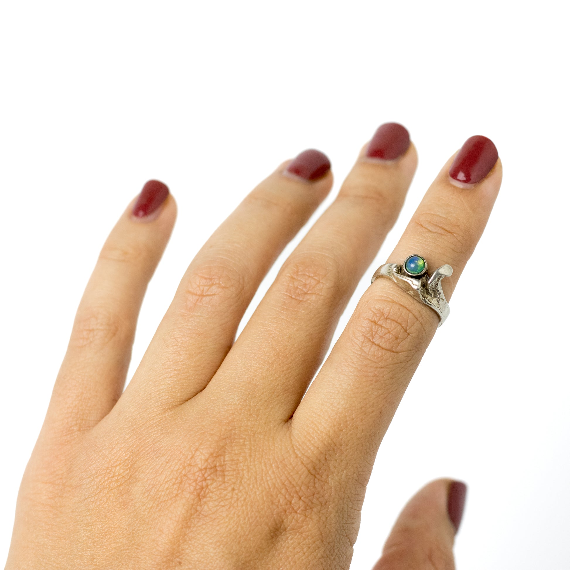 This vintage brutalist ring features a natural opal cabochon nestled in a fluid, sculptural silver setting. The opal exhibits vibrant green and blue flashes, characteristic of its organic beauty. Dating back to the 1960s or 1970s, this piece exemplifies mid-century modern craftsmanship.