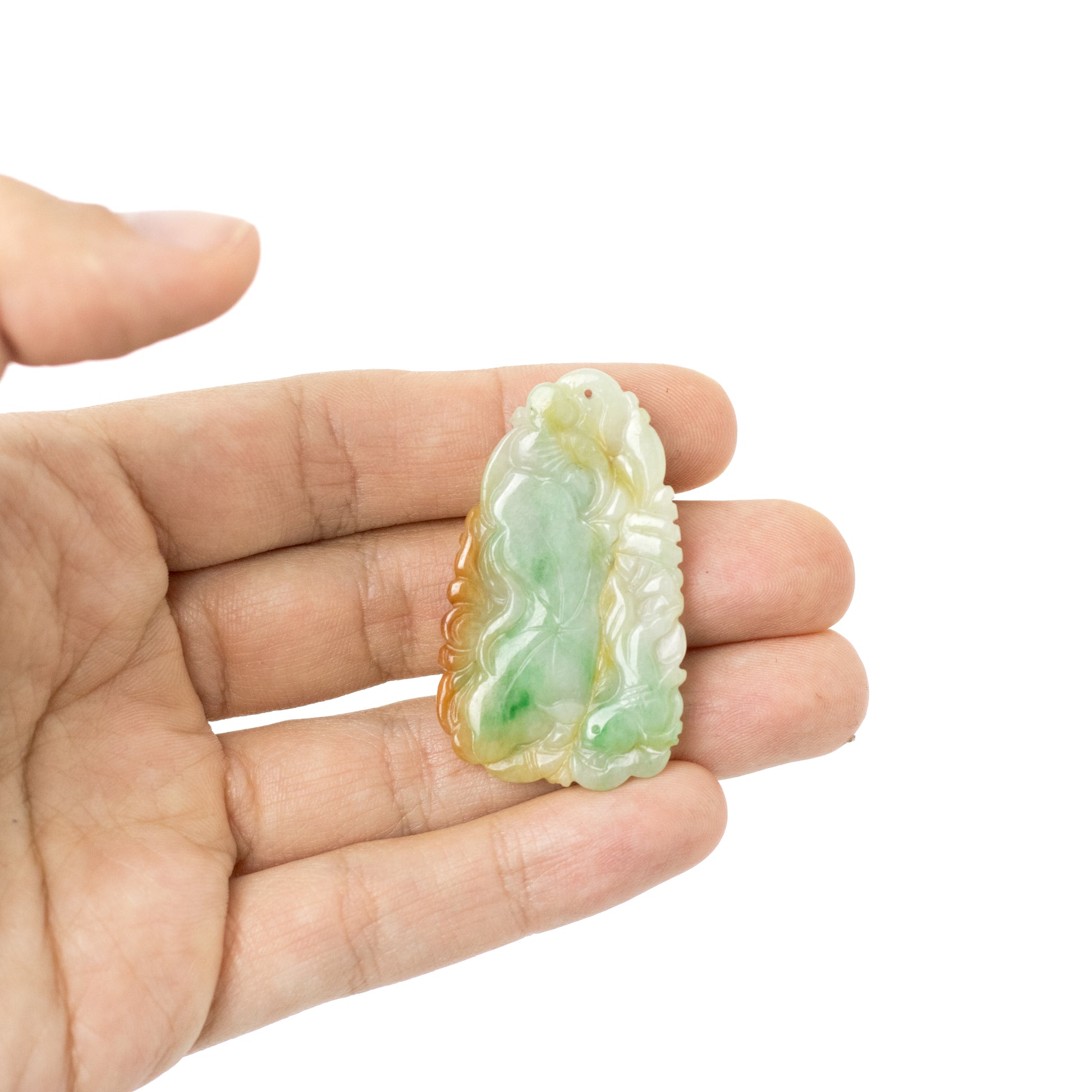 Vintage carved natural jadeite jade pendant combining soft green and honey-toned coloration. Both sides display hand-carved motifs of lotus leaves and stylised fish. Lotus-and-fish motifs (蓮魚) are an auspicious pairing in Chinese symbolism, representing continuous abundance and harmony. Natural colour zones in jadeite are traditionally appreciated for emphasising the carved imagery.