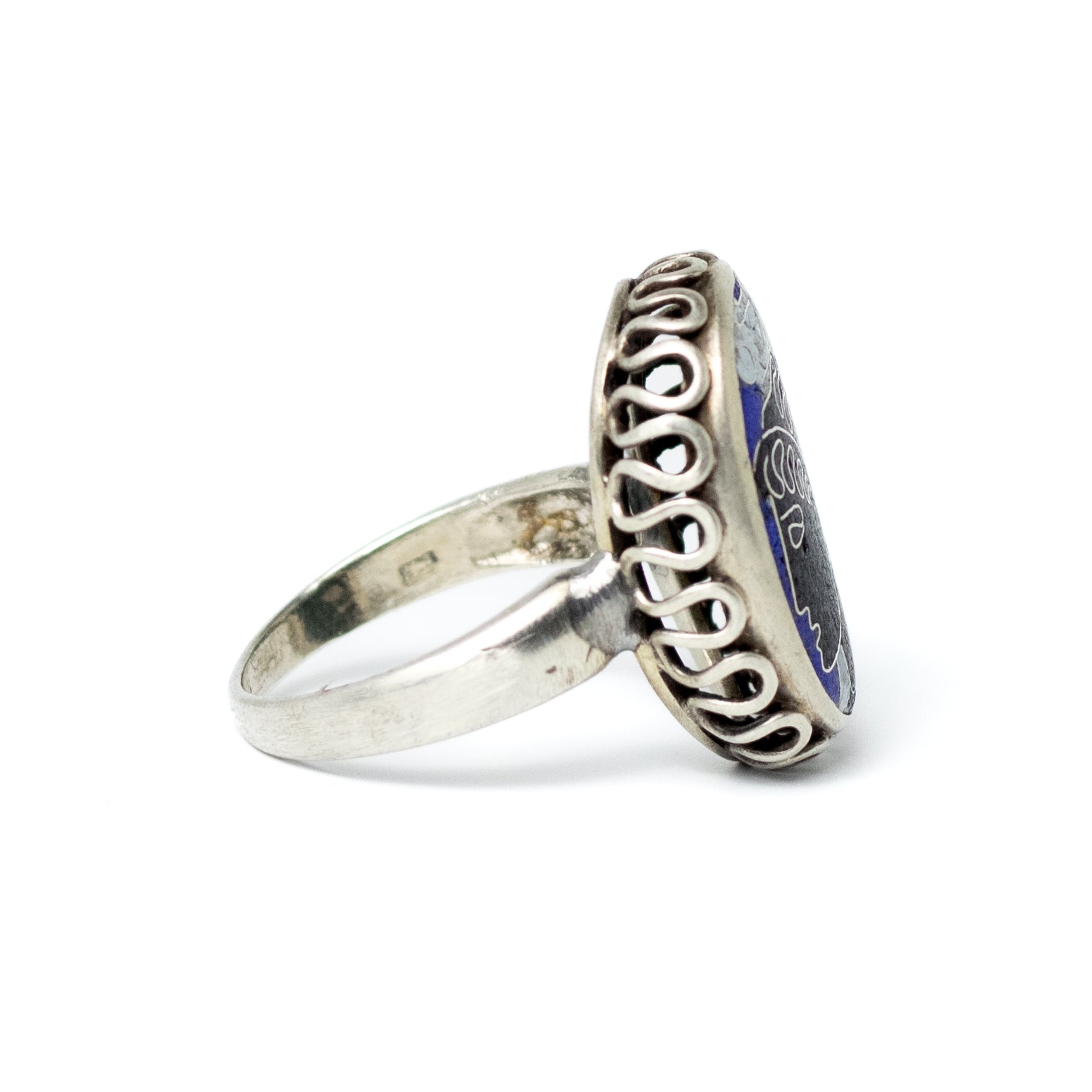 Vintage silver ring featuring an oval cloisonné enamel panel depicting an ancient Greek woman. The hand-applied enamel reveals deep blue, black, and soft neutral tones framed in a decorative silver bezel.