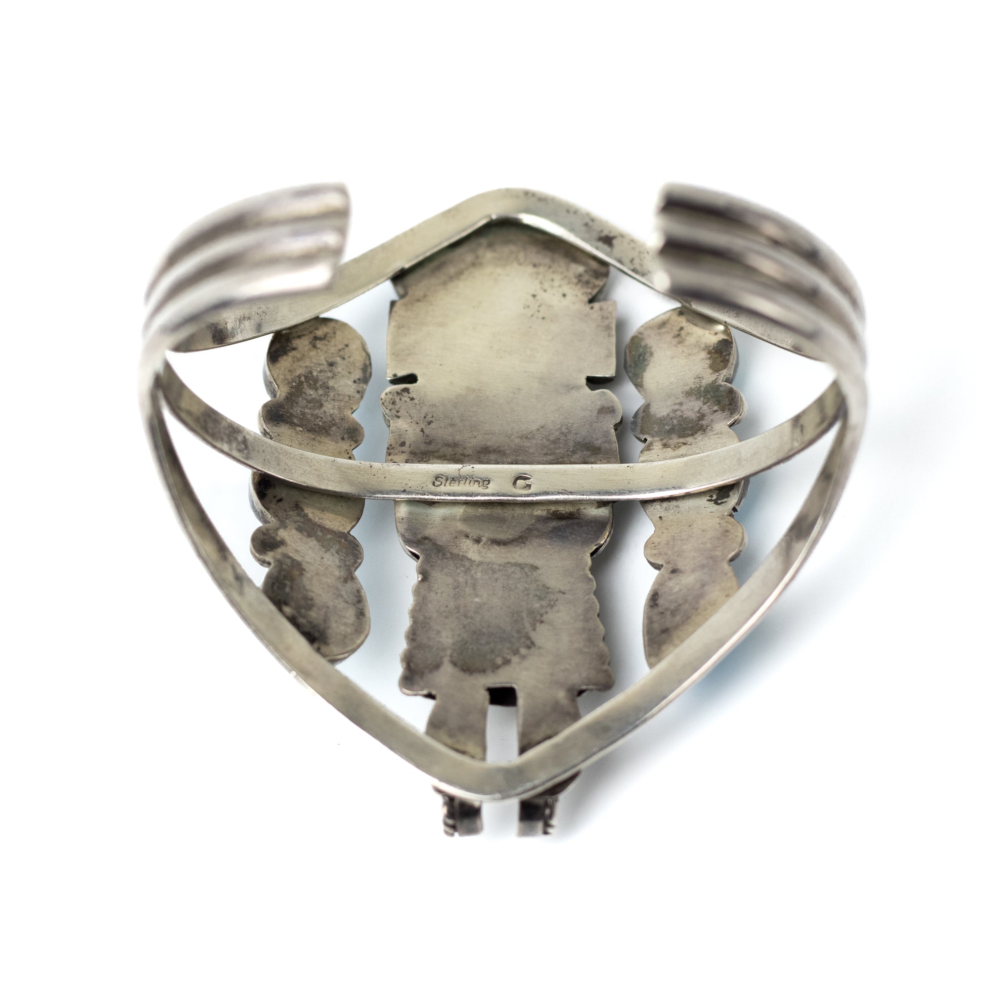 The cuff is stamped Sterling and G, a mark associated with several mid-20th-century Navajo silversmiths whose work often combined figural elements with turquoise cluster settings.